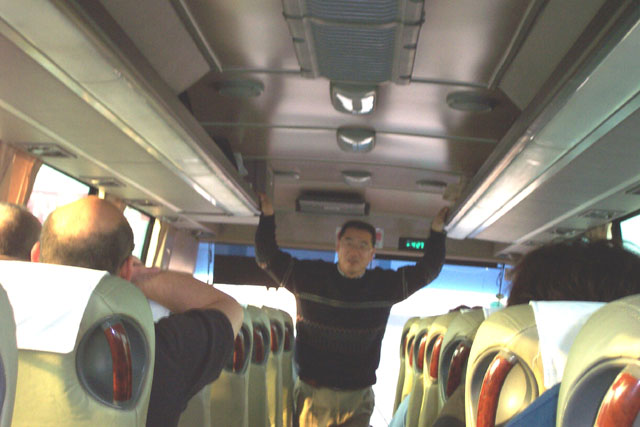 On the bus in Beijing, tour guide Leon addresses the group. |